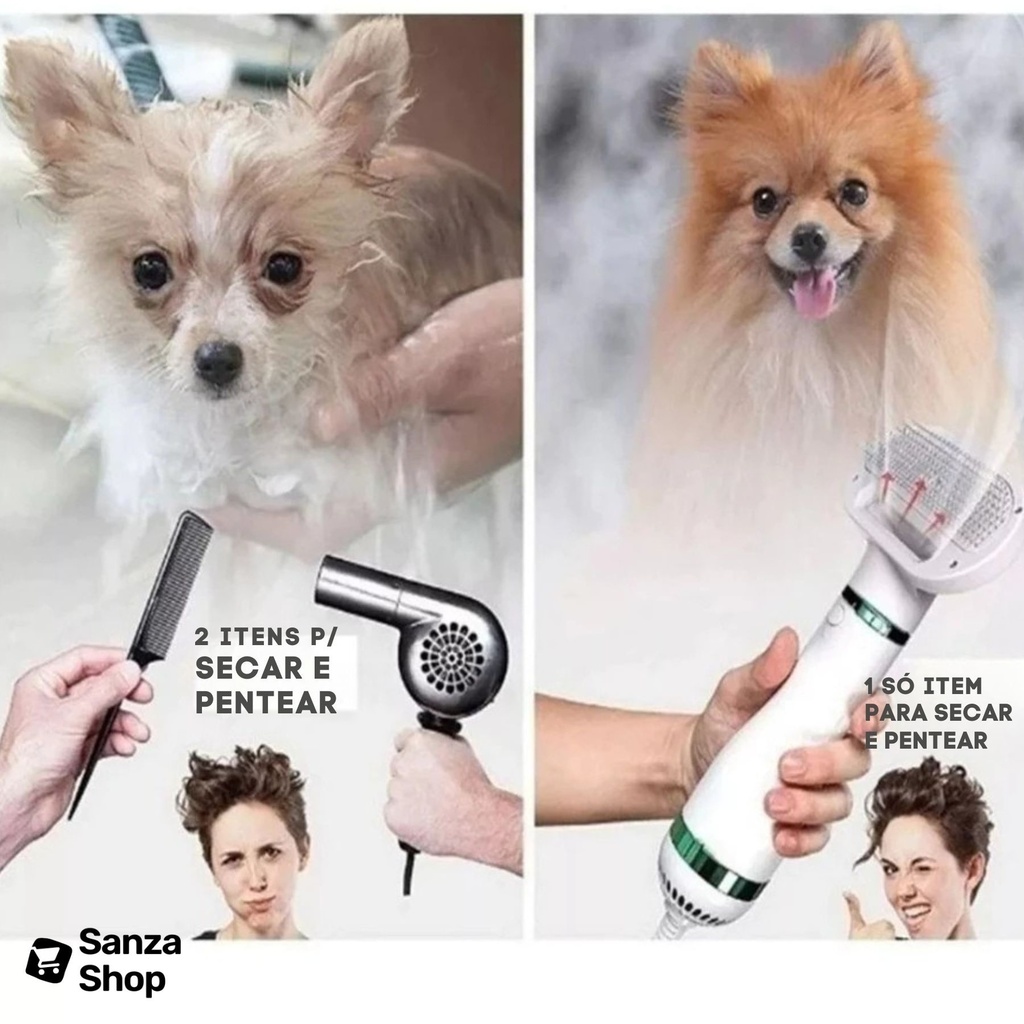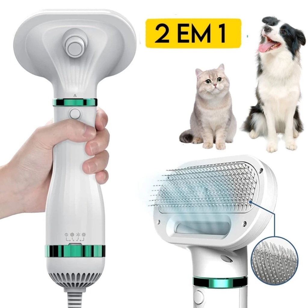 Além de sua funcionalidade dual, o produto destaca-se pelo seu design ergonômico, que facilita o manuseio e a operação com apenas uma mão, liberando a outra para maior controle durante o cuidado. Ele é leve, portátil e oferece dois níveis de temperatura ajustáveis, otimizando o tempo de secagem sem riscos de superaquecimento, o que é essencial para a segurança do animal.