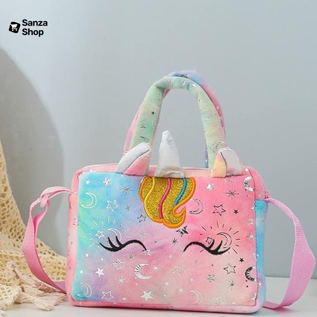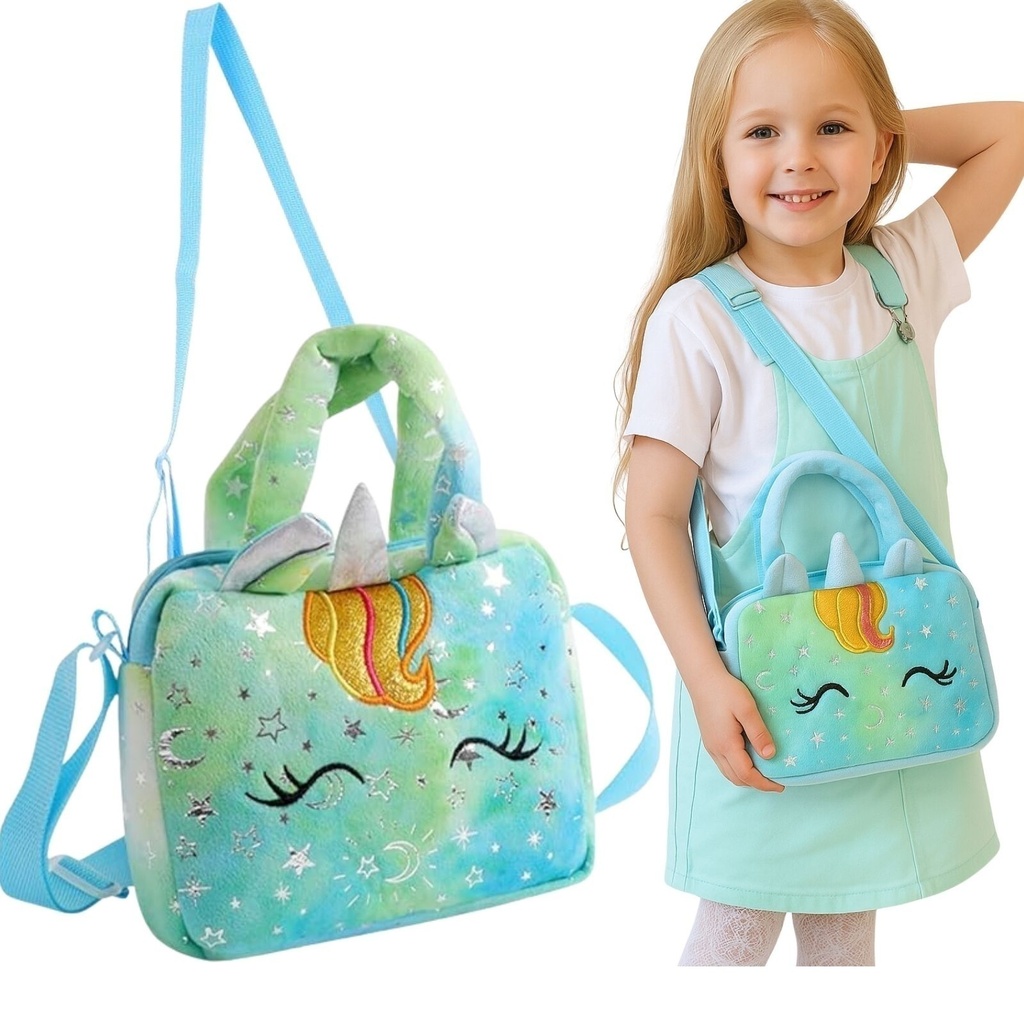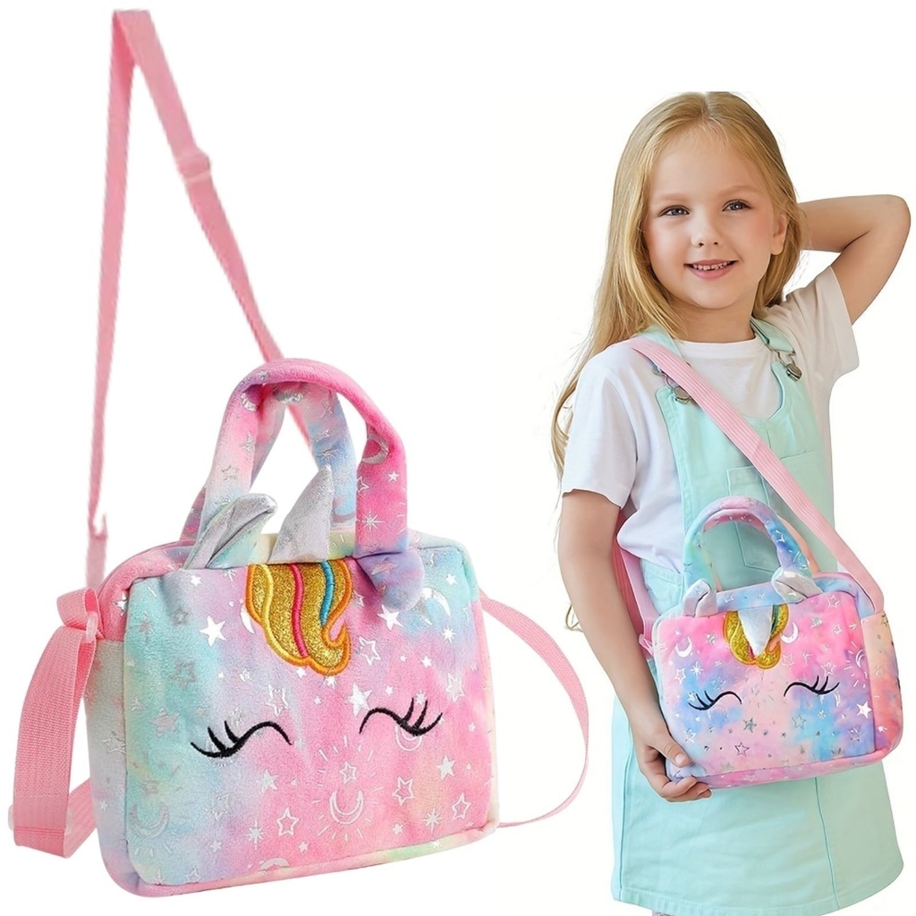 • Bolsinha Unicórnio 3D (pelúcia) – Cores: Rosa, Verde, Roxo com Rosa